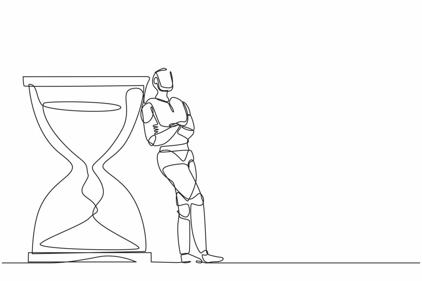 Single one line drawing robot lean on giant hourglass. Future technology development. Artificial intelligence and machine learning process. Continuous line draw design graphic vector illustration Pro Vector