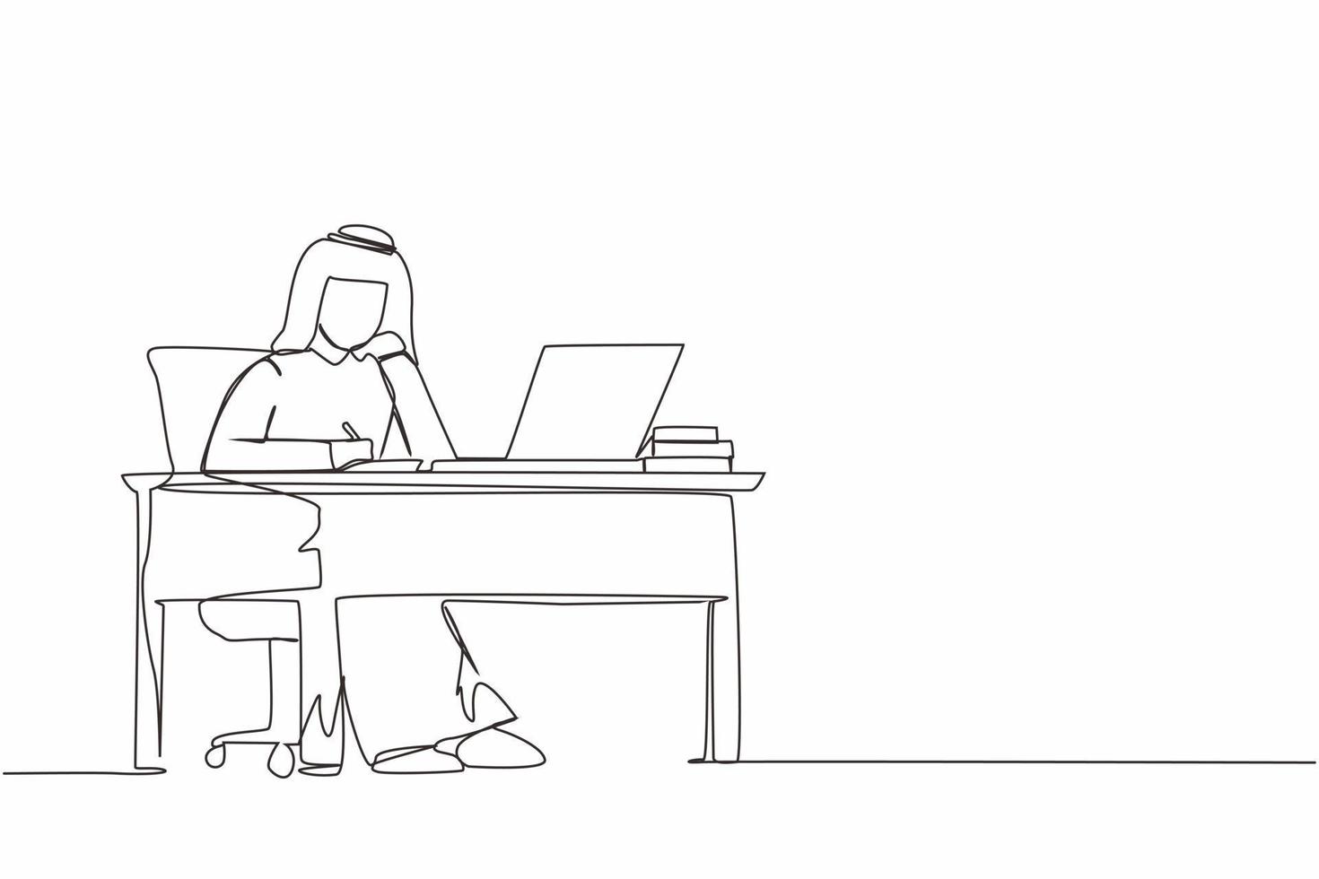 Single continuous line drawing Arabic businessman writing sitting in front of laptop at table. Young male studying and writing in notebook, at desk in front of computer. One line graphic design vector Pro Vector