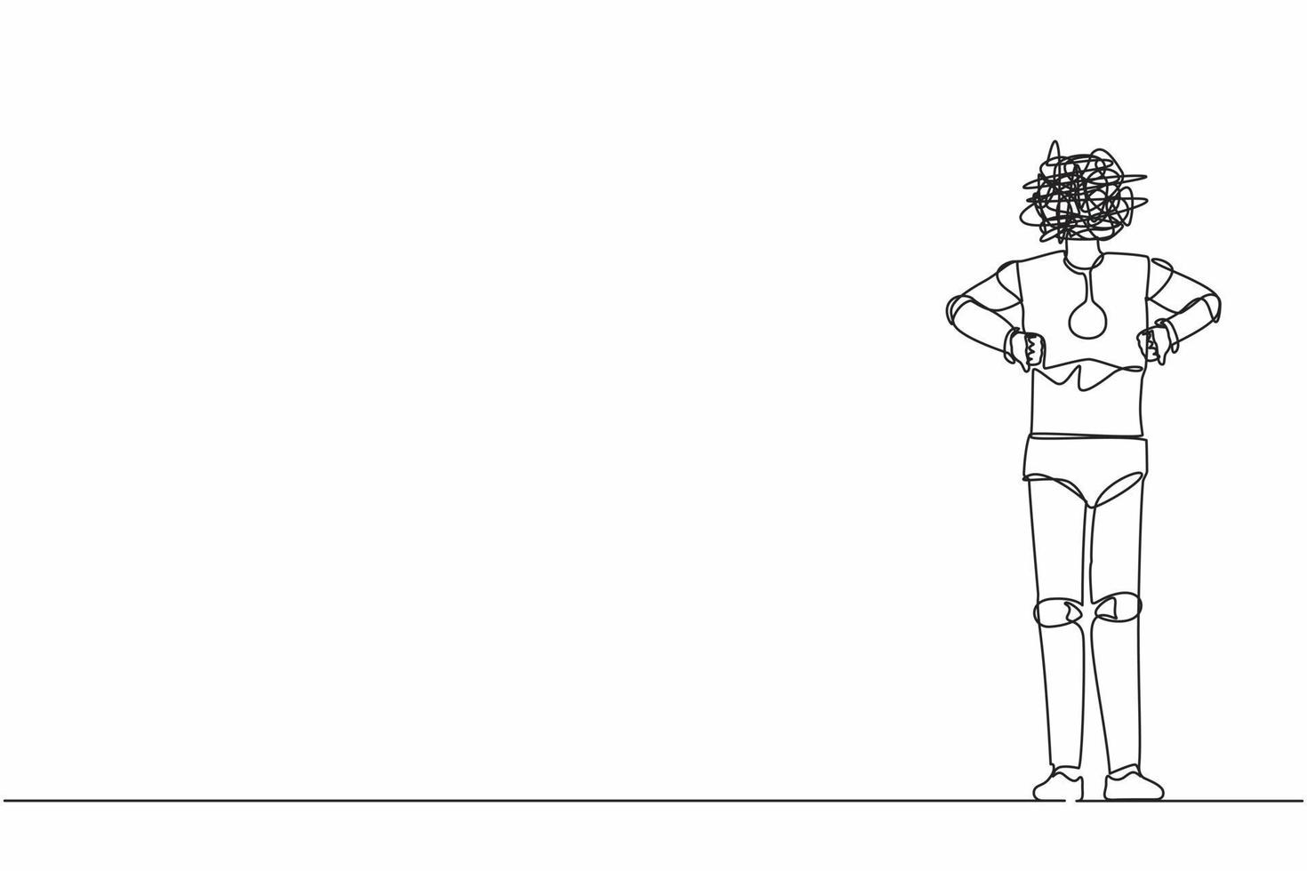 Single one line drawing robot with round scribbles instead of head, standing and showing thumbs down sign. Disagreement, dislike. Humanoid robot cybernetic. Continuous line design vector illustration Pro Vector