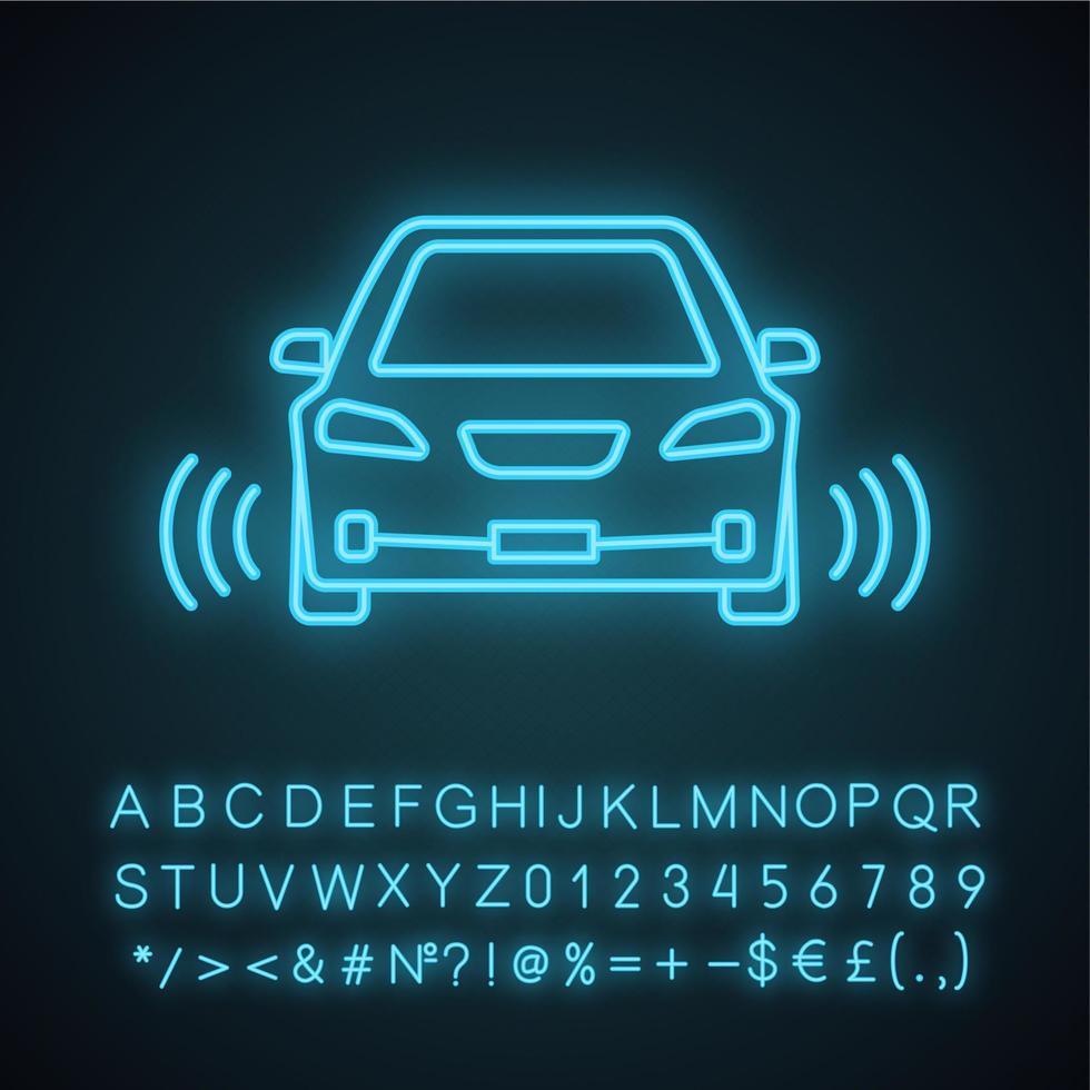 Smart car in front view neon light icon. NFC auto with radar sensors. Glowing sign with alphabet, numbers and symbols. Self driving automobile. Autonomous car. Vector isolated illustration Pro Vector