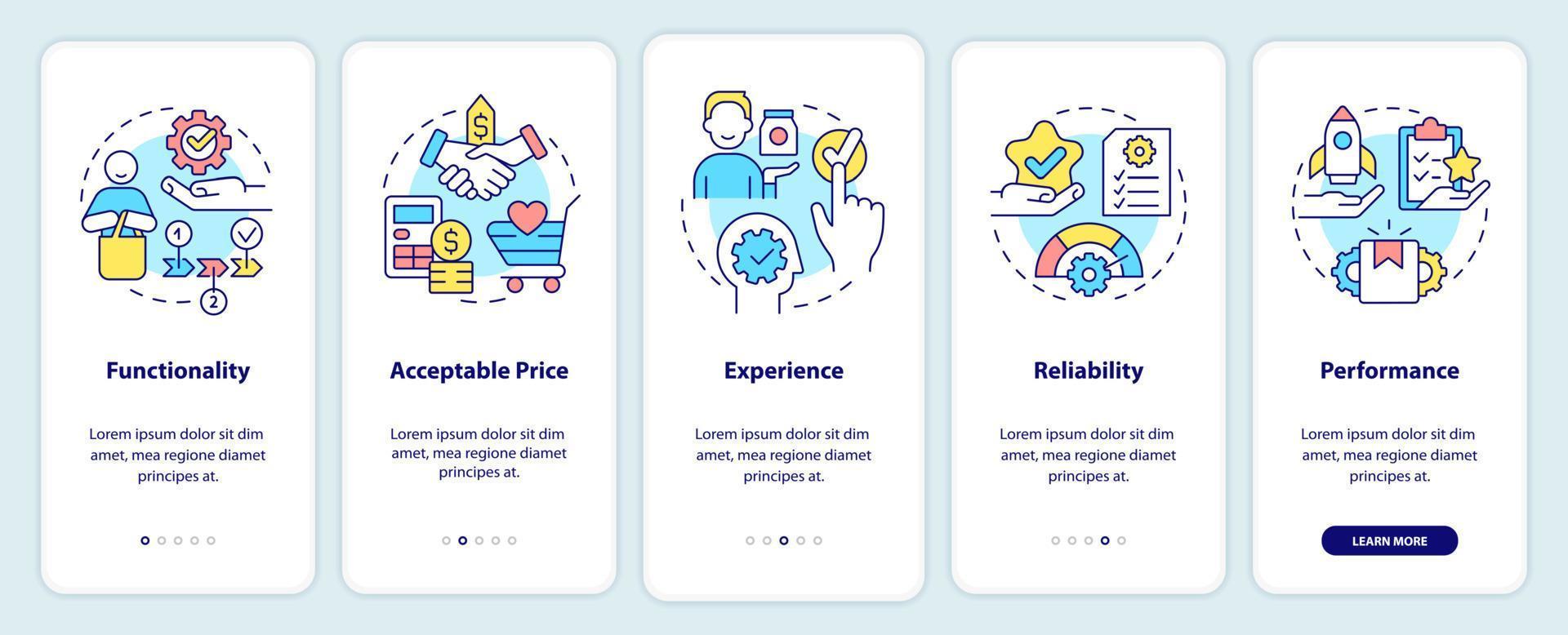 Product needs onboarding mobile app screen. Goods and service walkthrough 5 steps graphic instructions pages with linear concepts. UI, UX, GUI template. Pro Vector