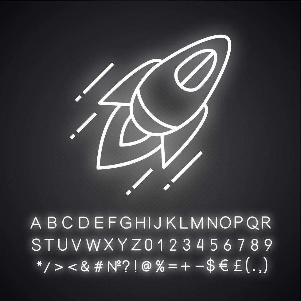 Rocket neon light icon. Startup launch. Flying spaceship. Glowing sign with alphabet, numbers and symbols. Vector isolated illustration Pro Vector