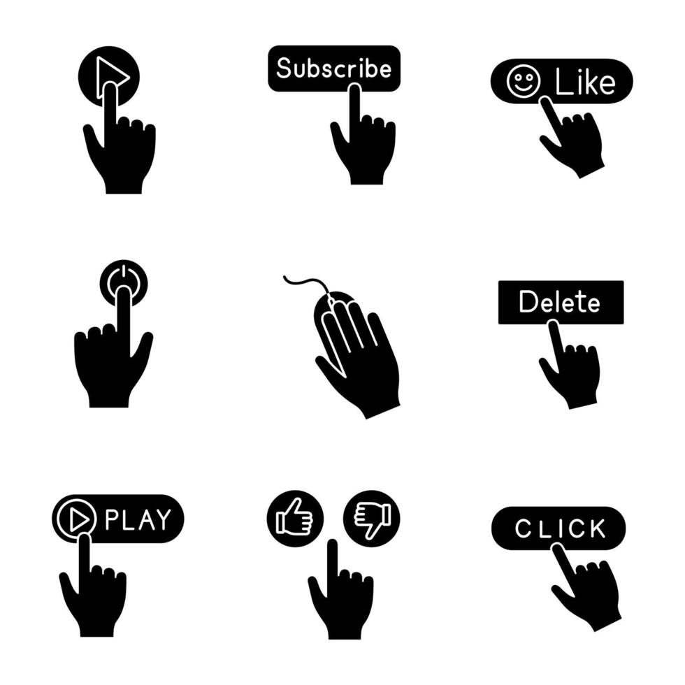 App buttons glyph icons set. Click. Play, subscribe, like, power, computer mouse, delete, play, thumbs up and down. Silhouette symbols. Vector isolated illustration Pro Vector