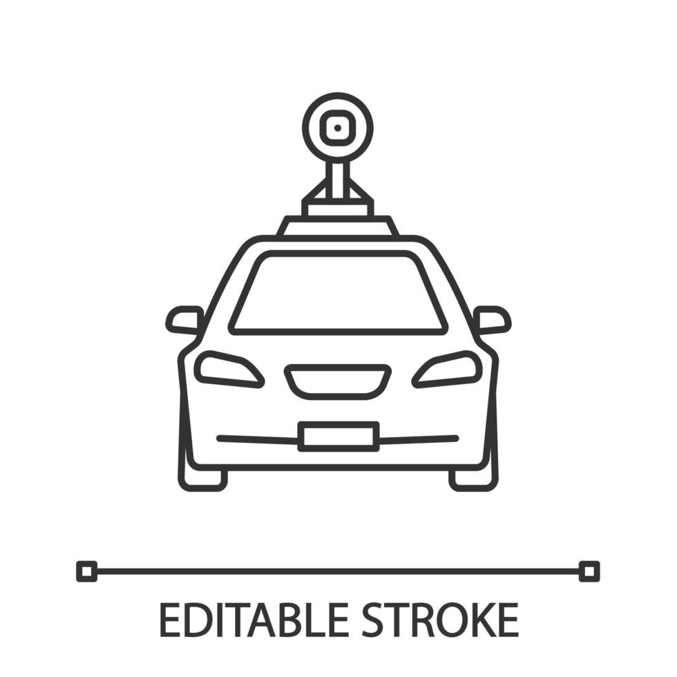 Smart car in front view linear icon. NFC auto with roof camera and radar sensor. Thin line illustration. Autonomous car. Driverless vehicle. Contour symbol. Vector isolated drawing. Editable stroke Pro Vector