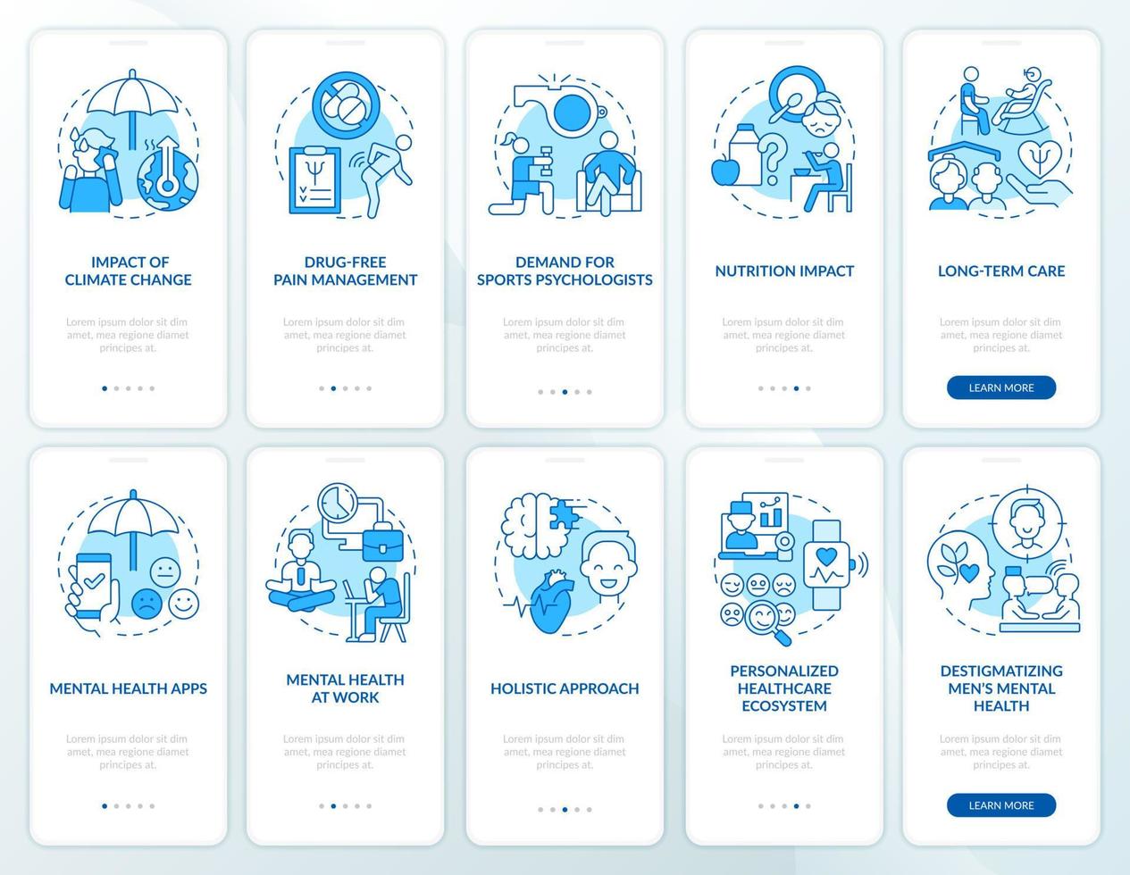 Trends in psychology blue onboarding mobile app screen set. Mental health walkthrough 5 steps graphic instructions pages with linear concepts. UI, UX, GUI template. Pro Vector