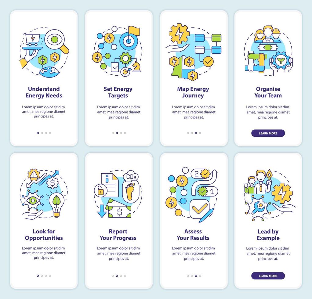 Energy management onboarding mobile app screen set. Asset results walkthrough 4 steps graphic instructions pages with linear concepts. UI, UX, GUI template. Pro Vector