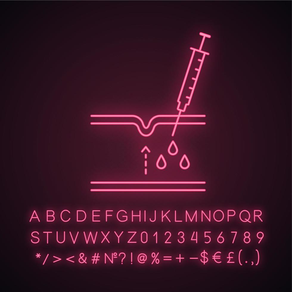 Neurotoxin injection neon light icon. Subcutaneous injection with neuro toxin. Wrinkles reducing process in skin section. Glowing sign with alphabet, numbers. Vector isolated illustration Pro Vector