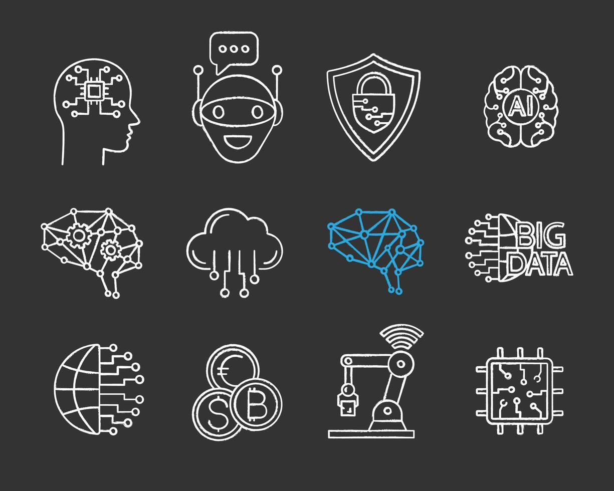 Artificial intelligence chalk icon set. AI. Internet of things. Digital network. Neurotechnology. Isolated vector chalkboard illustrations Pro Vector