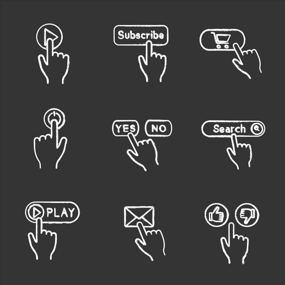 App buttons chalk icons set. Click. Play, subscribe, buy, power, yes or no, search bar, play, message, dislike or like. Isolated vector chalkboard illustrations Pro Vector