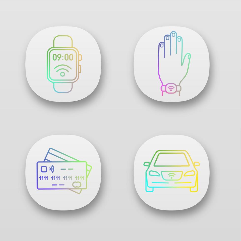NFC technology app icons set. Near field smartwatch, bracelet, credit cards, car. UI UX user interface. Web or mobile applications. Vector isolated illustrations Pro Vector