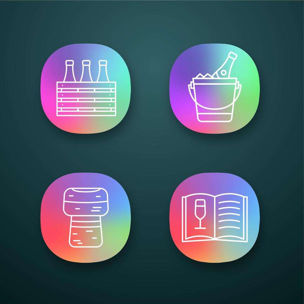 Alcohol app icons set. Bar. Wine. Beer case, champagne bucket, cork, wine menu. UI UX user interface. Web or mobile applications. Vector isolated illustrations Pro Vector