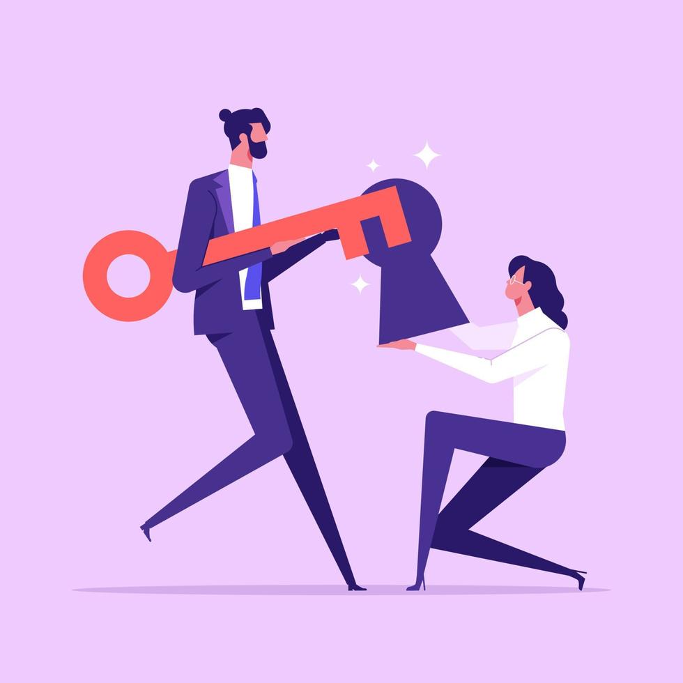 Two People Working Together Open New Solutions to solve problem. Teamwork and innovation concept Pro Vector