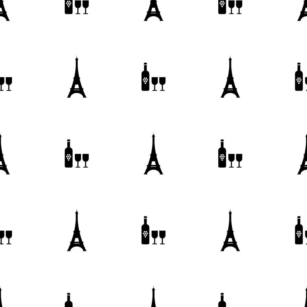 Seamless pattern paris symbols. Bottle of wine and eiffel tower on white background. Vector illustration for design, web, wrapping paper, fabric, wallpaper Pro Vector
