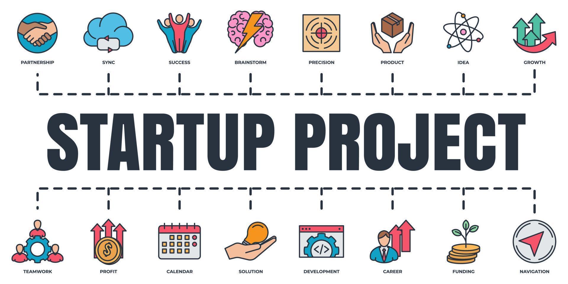 Startup project and development banner web icon set. solution, brainstorm, calendar, idea, growth, partnership, success and more vector illustration concept. Pro Vector