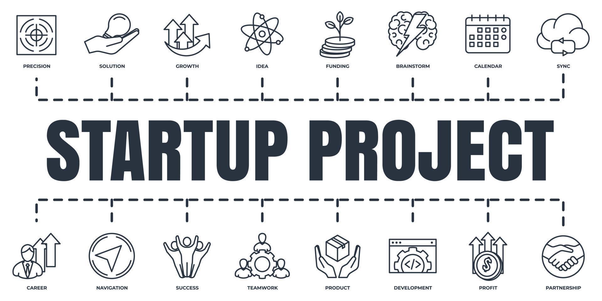 Startup project and development banner web icon set. solution, brainstorm, calendar, idea, growth, partnership, success and more vector illustration concept. Pro Vector