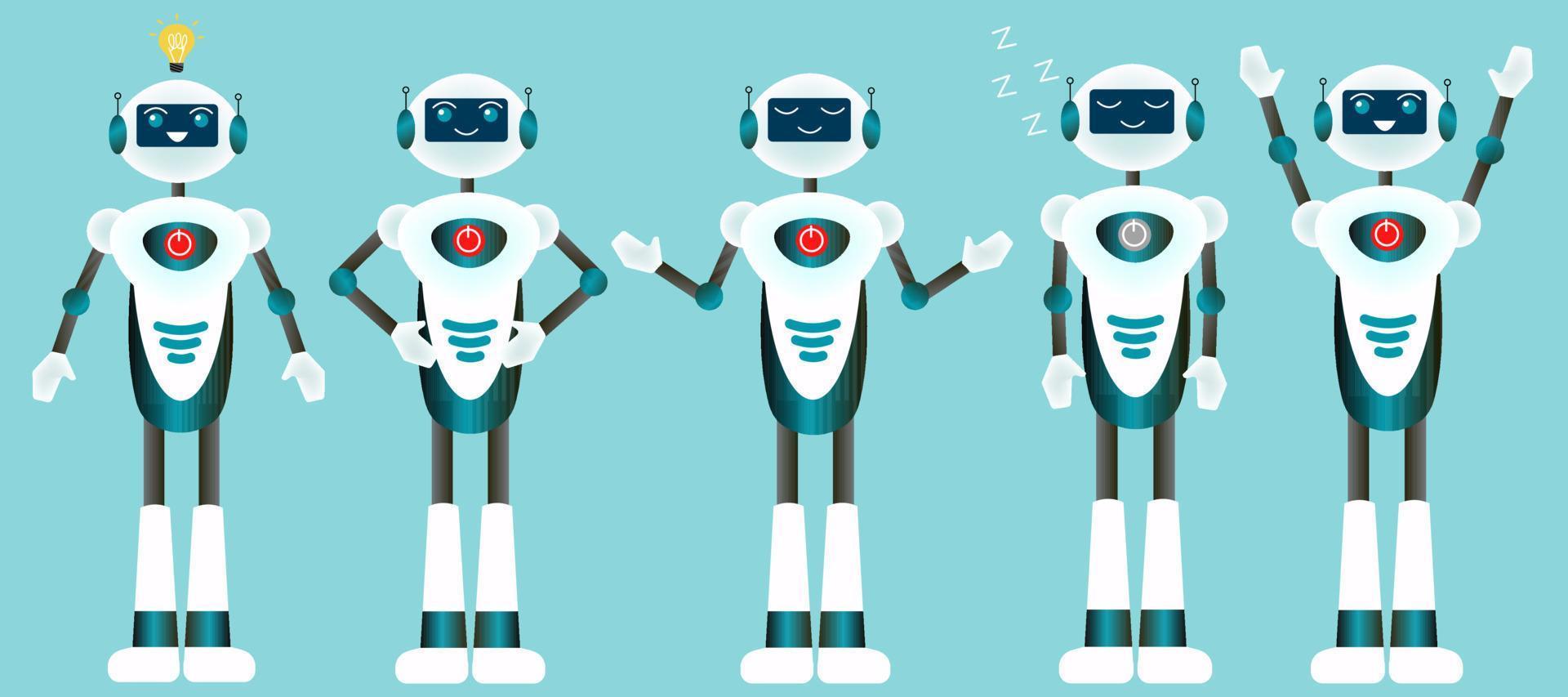 Set of robots performing different actions. Funny cartoon characters for mobile app or game. Flat vector illustration. Pro Vector