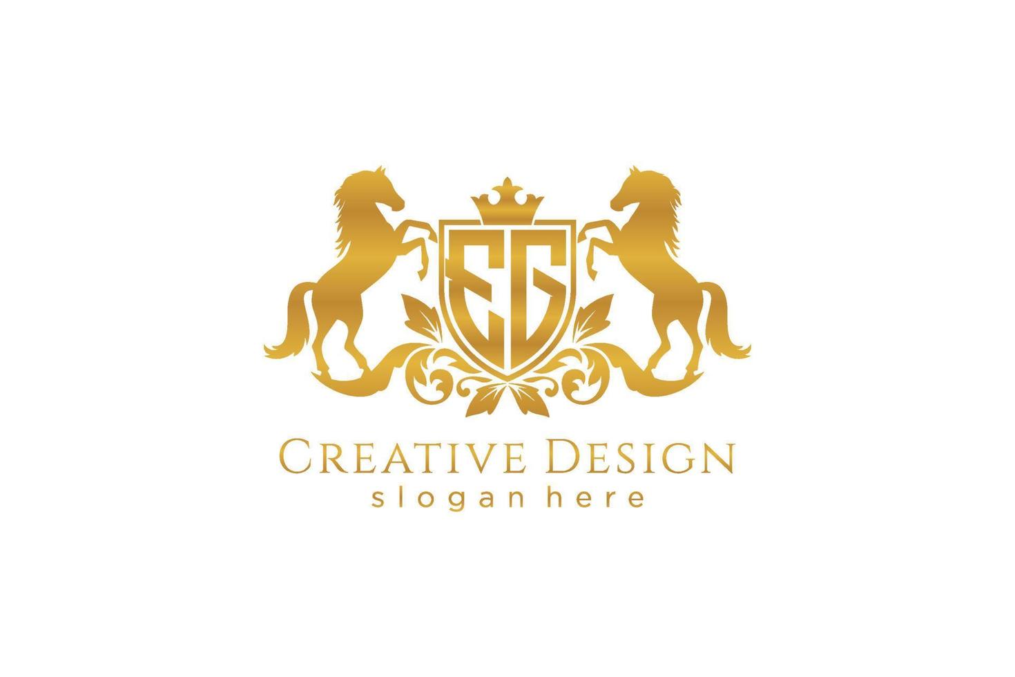 initial EG Retro golden crest with shield and two horses, badge template with scrolls and royal crown - perfect for luxurious branding projects Pro Vector and Pro SVG