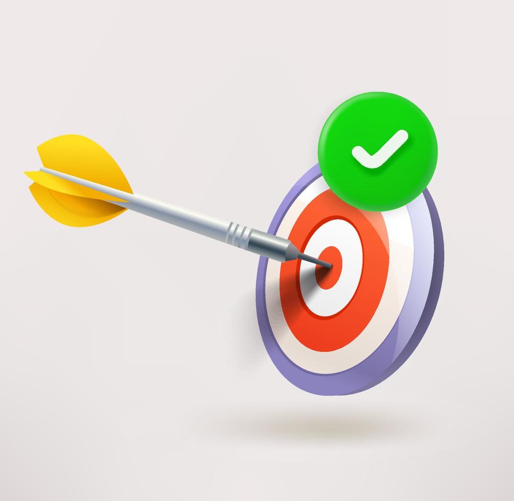 Dart in a bulls eye icon with checkmark. 3d vector icon Pro Vector