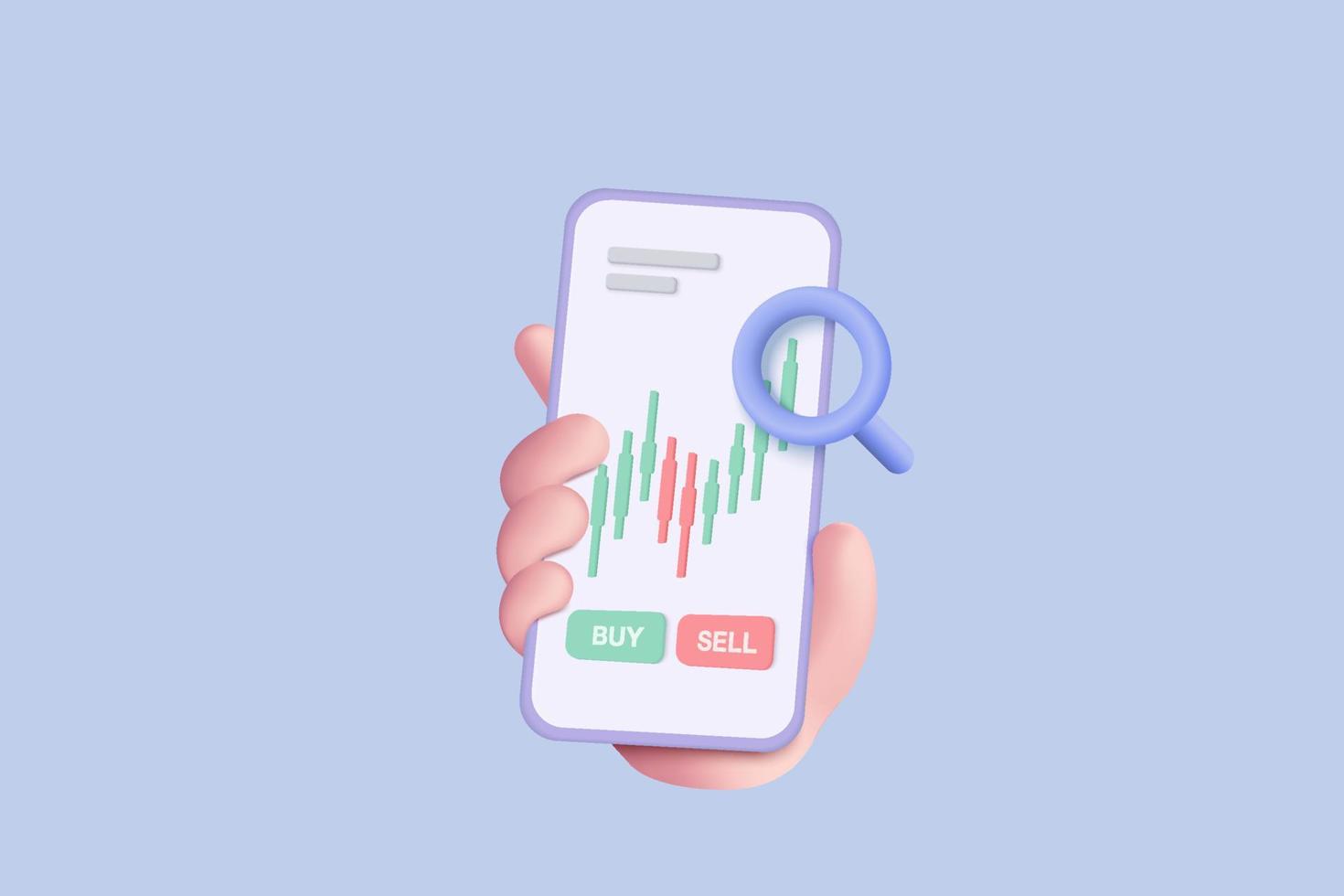 3D vector hand holding mobile isolated on pastel blue background. Hand using funding business graph on application under creative solution concept in 3D vector. 3d trading for business investment Pro Vector