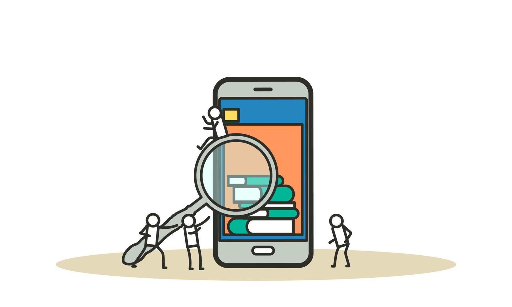 Online book library vector illustration concept with people. Education with phone or computer. Digital knowledge study. App learning banner technology background. Reading bookshelf in bookstore Pro Vector