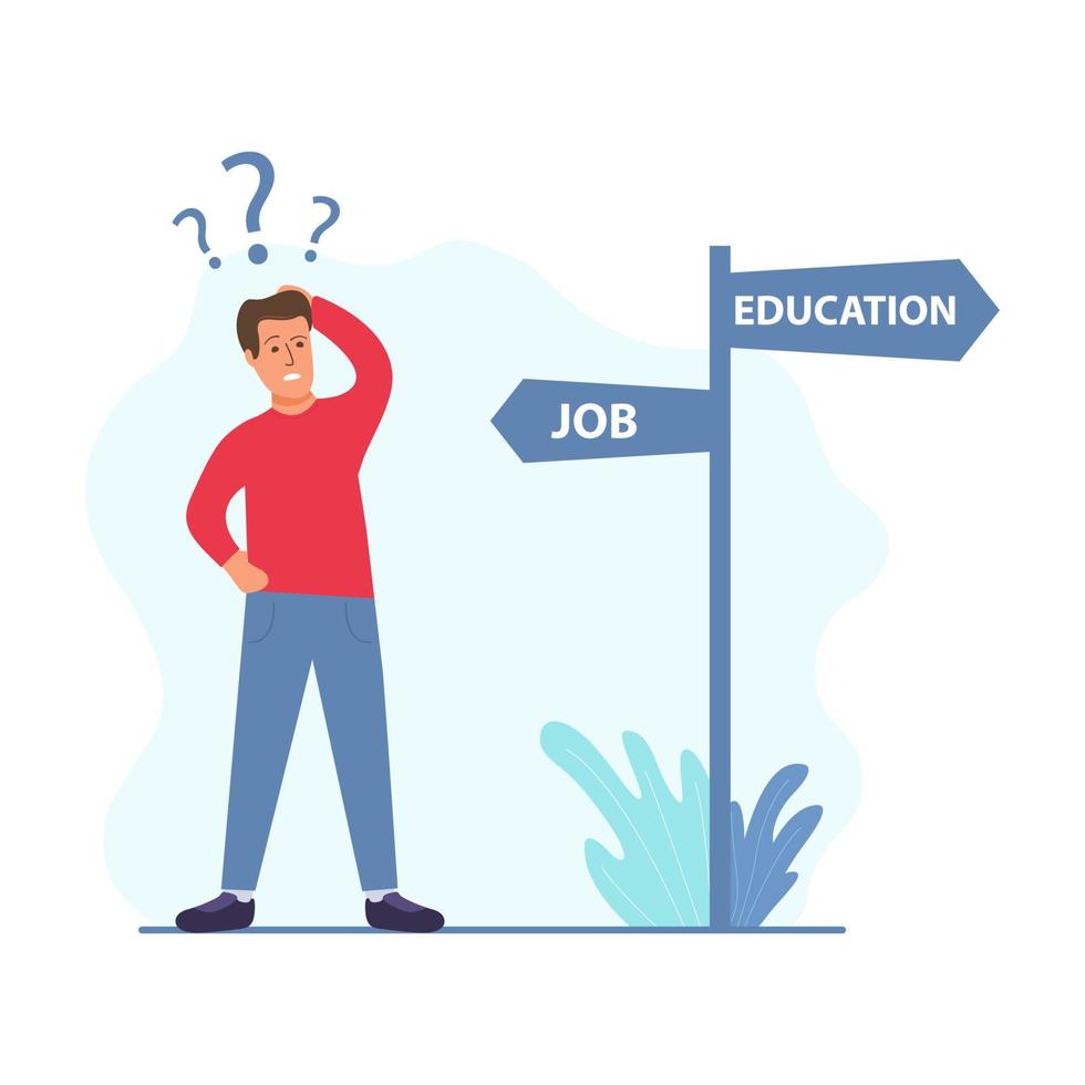 Choice way signpost.Man standing difficult choice.Choosing education or work.Where is the direction to go.Young man at road pointer.Character question marks above his head.Making decision.Vector flat. Pro Vector