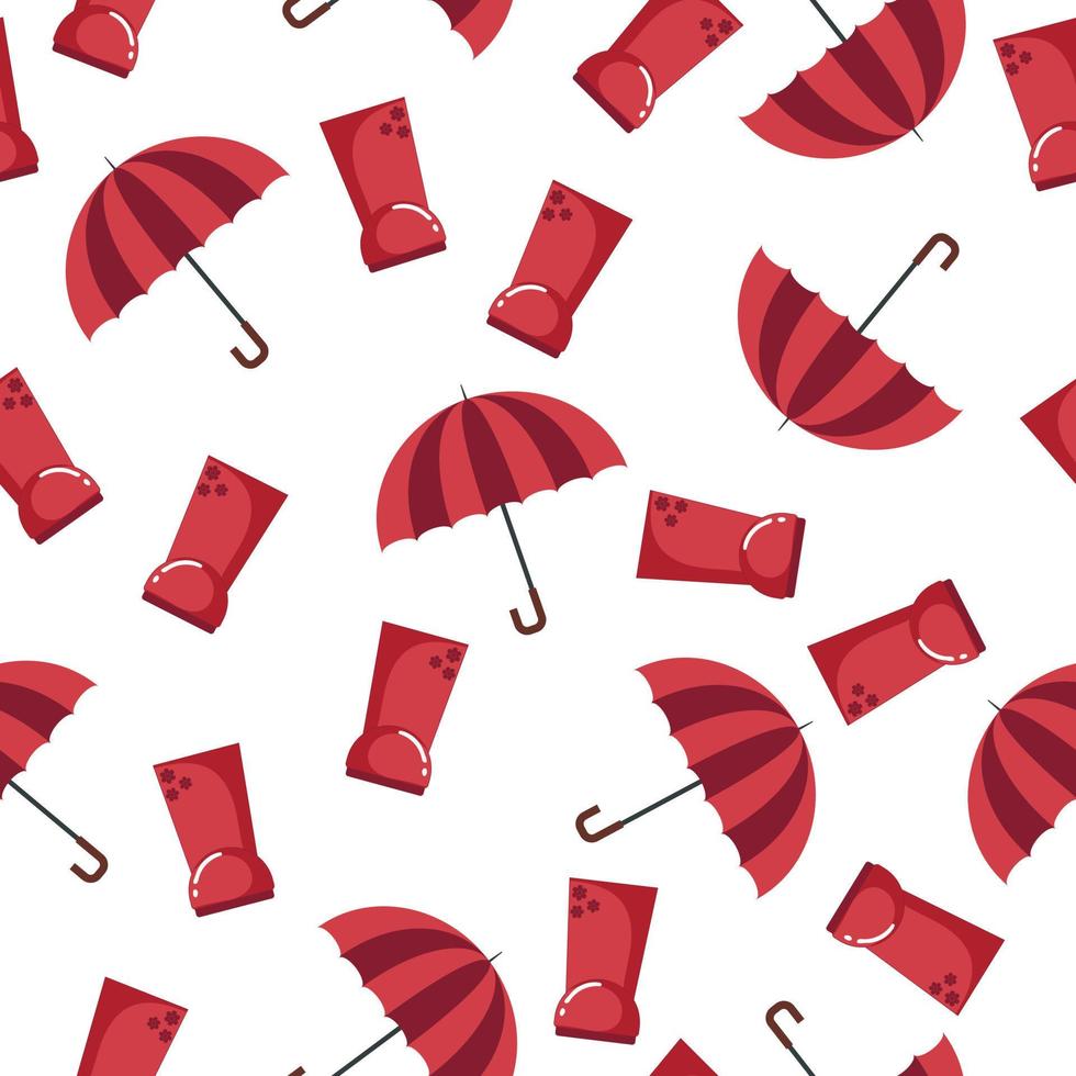 Seamless autumn pattern with red rubber boots and an umbrella for rainy weather in a flat style isolated on a white background Pro Vector