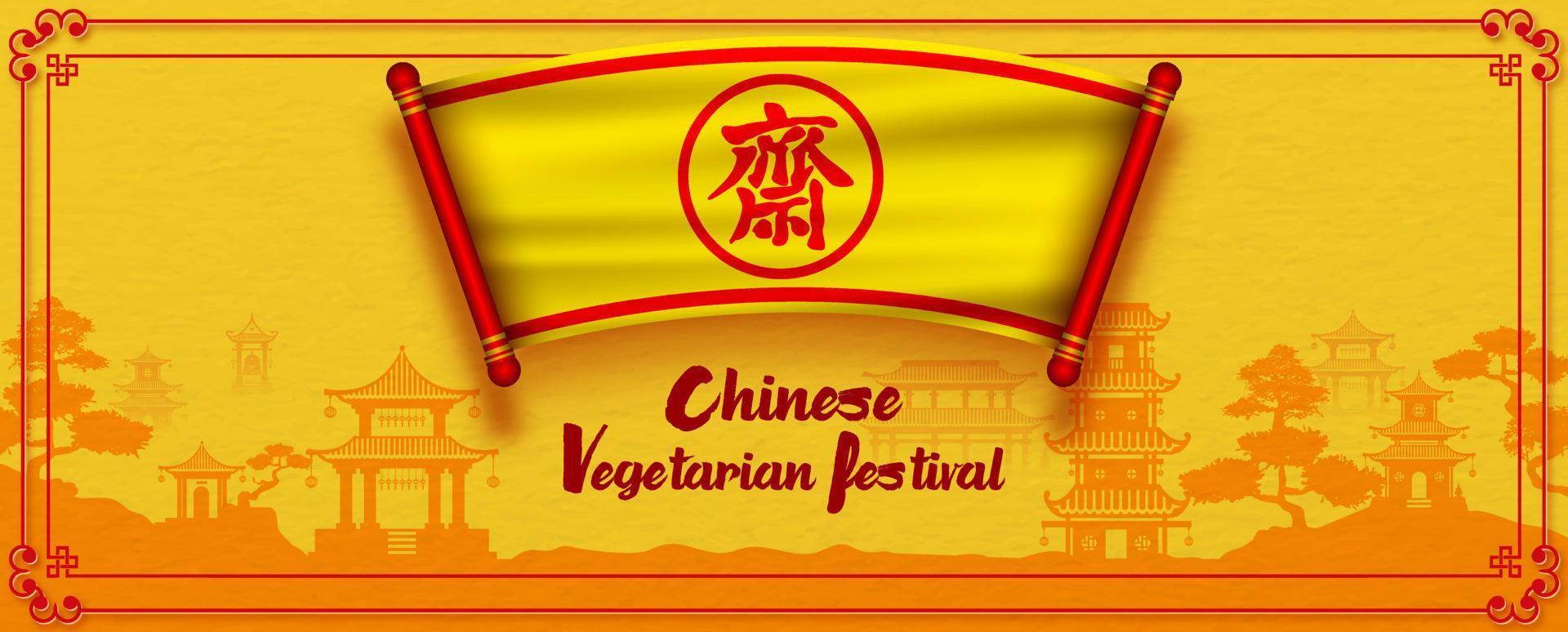 Chinese text on ancient fabric label with the name of event on Chinese ancient building landscape and yellow background. Chinese letters is meaning Fasting for worship Buddha in English. Pro Vector
