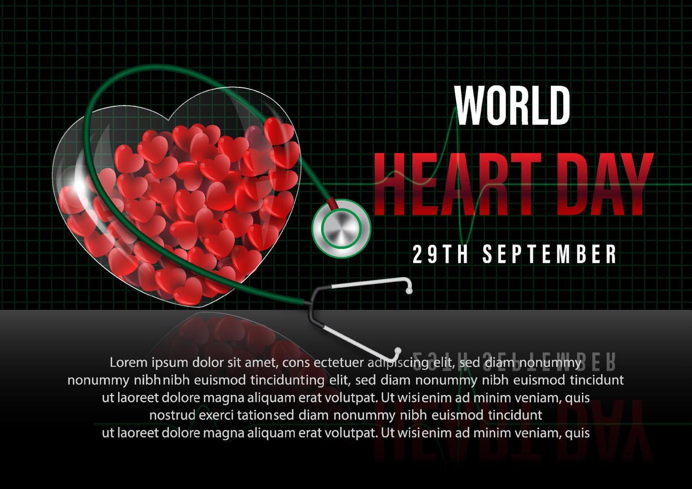 Doctor stethoscope on pile of hearts in a heart glass shape with the day and name of event lettering, example texts put on glossy floor and and black background. All in vector design. Pro Vector