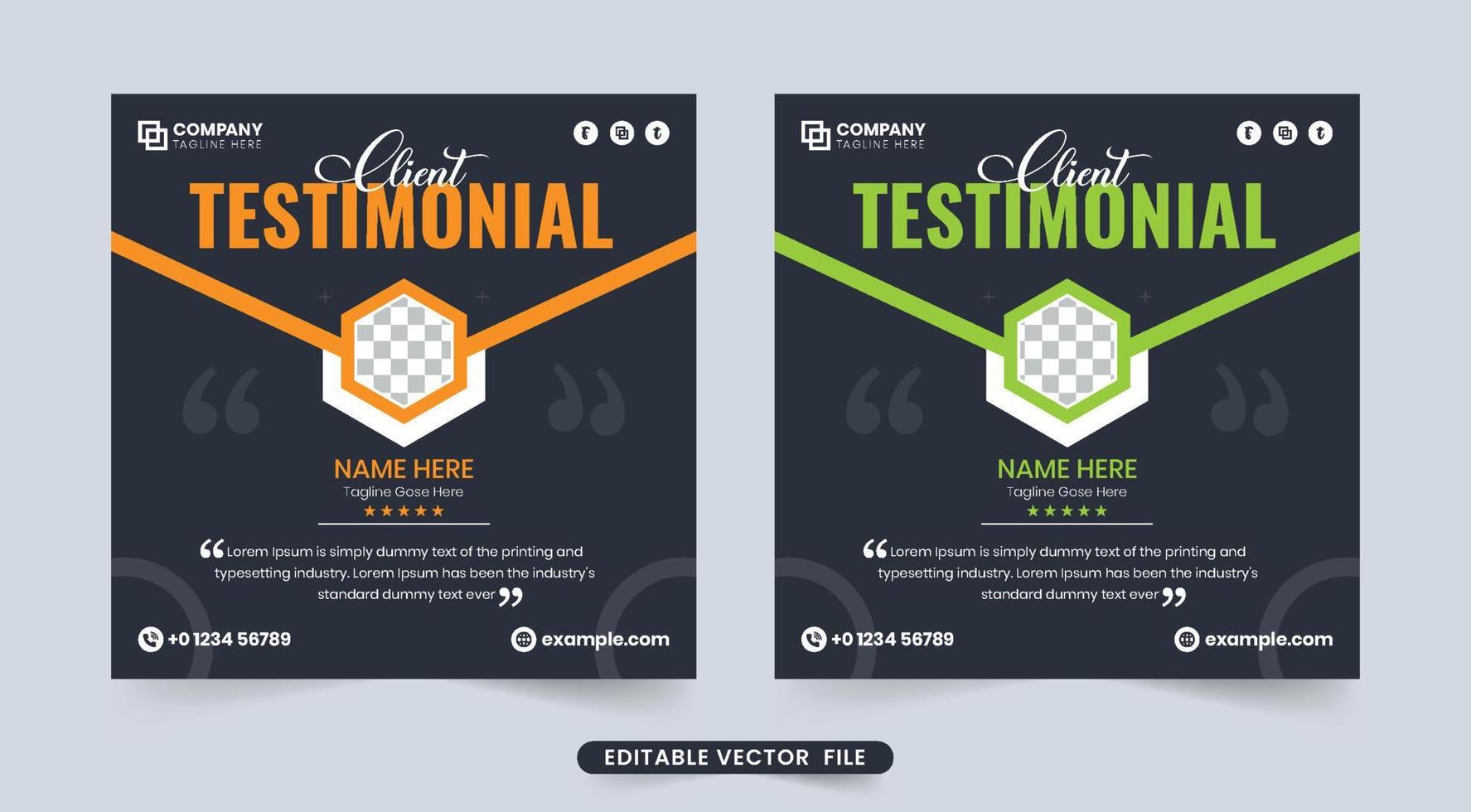 Minimal client review and customer feedback layout template for businesses and websites. Customer testimonial with orange and green text effect on dark backgrounds. Client service and work review. vector