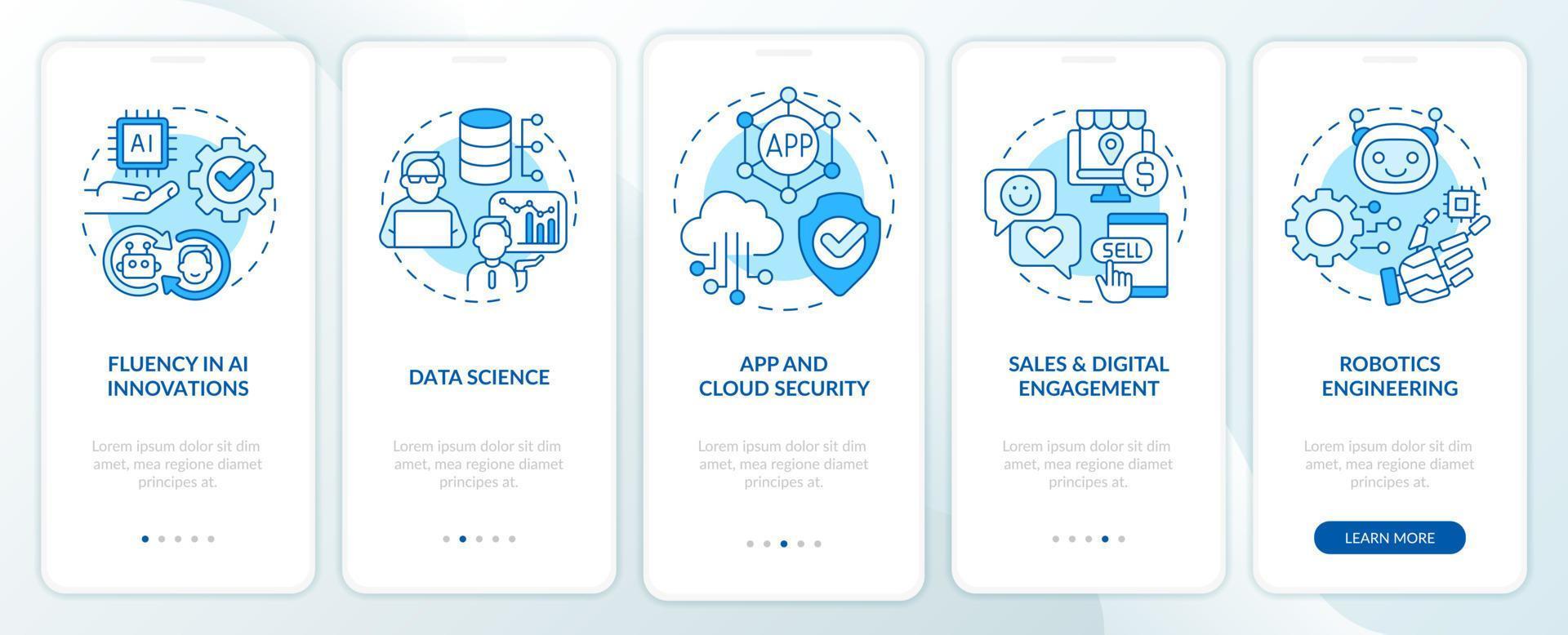 Learning top digital skills blue onboarding mobile app screen. Walkthrough 5 steps graphic instructions pages with linear concepts. UI, UX, GUI template. Pro Vector