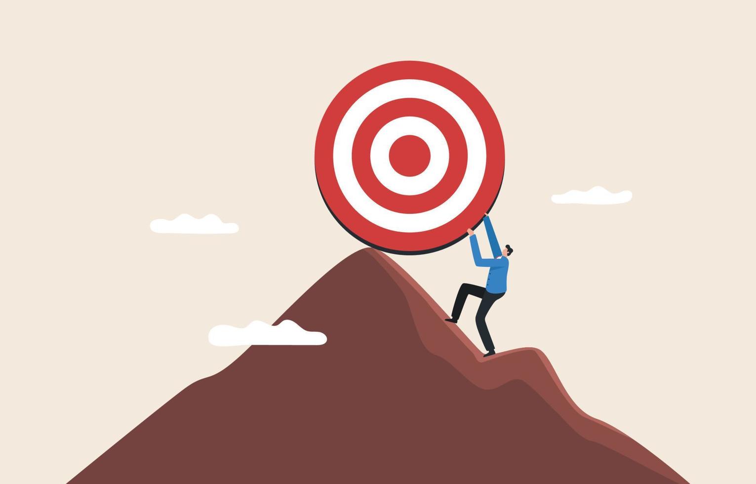 Setting targets and key Business goal. Set objective and achievement. Ascending to success at the top. Businessman leading archery target to set on the top of the mountain. Pro Vector