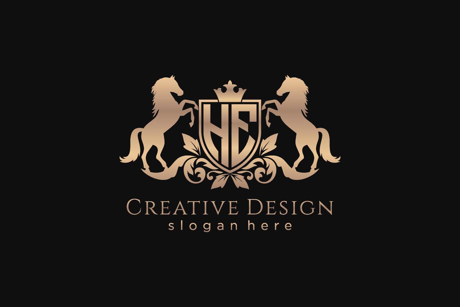 initial HE Retro golden crest with shield and two horses, badge template with scrolls and royal crown - perfect for luxurious branding projects Pro Vector and Pro SVG