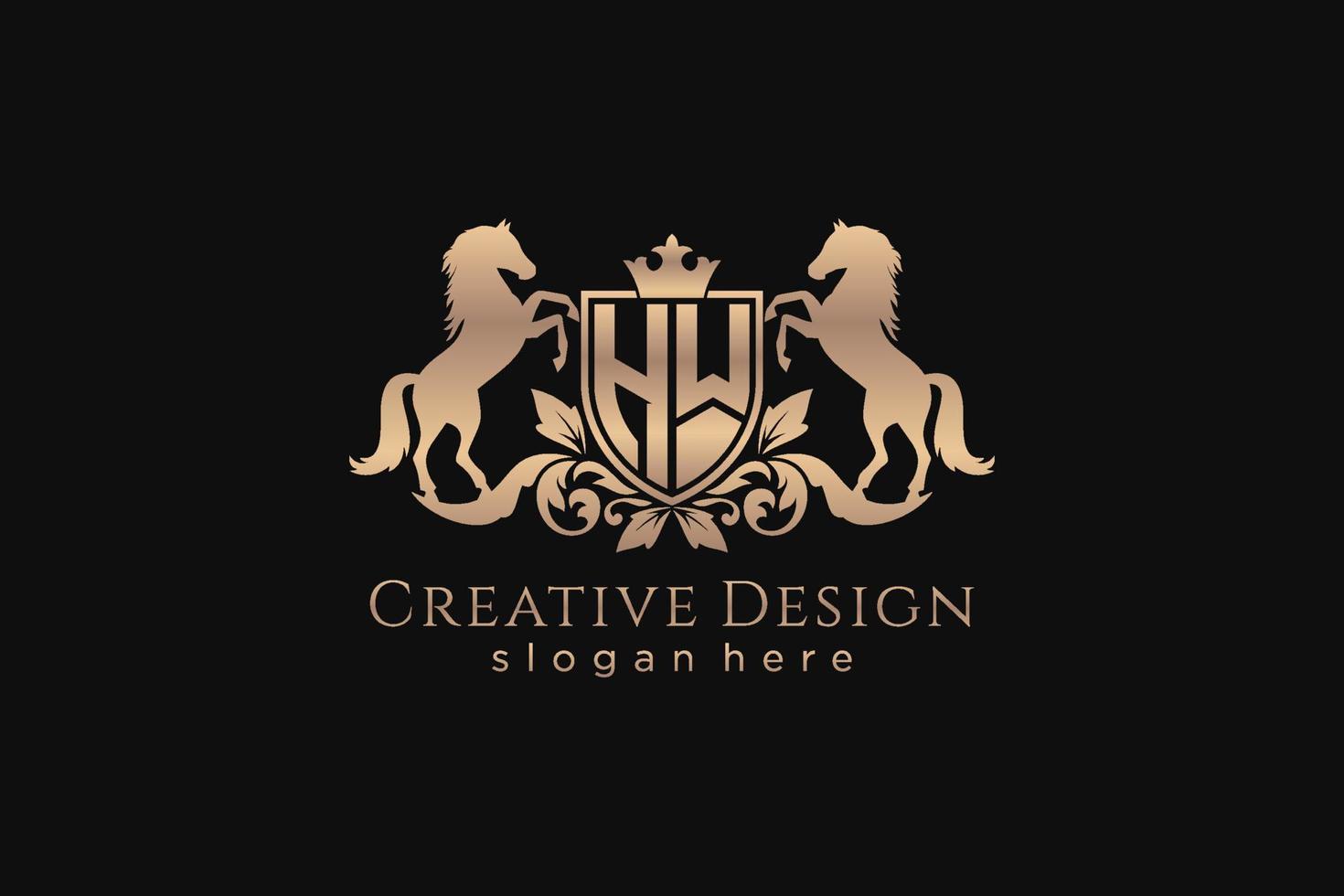 initial HW Retro golden crest with shield and two horses, badge template with scrolls and royal crown - perfect for luxurious branding projects Pro Vector and Pro SVG