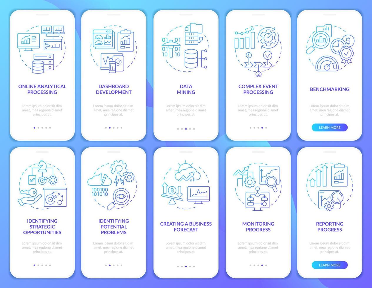 Data management solutions blue gradient onboarding mobile app screen set. Walkthrough 5 steps graphic instructions pages with linear concepts. UI, UX, GUI template. Pro Vector