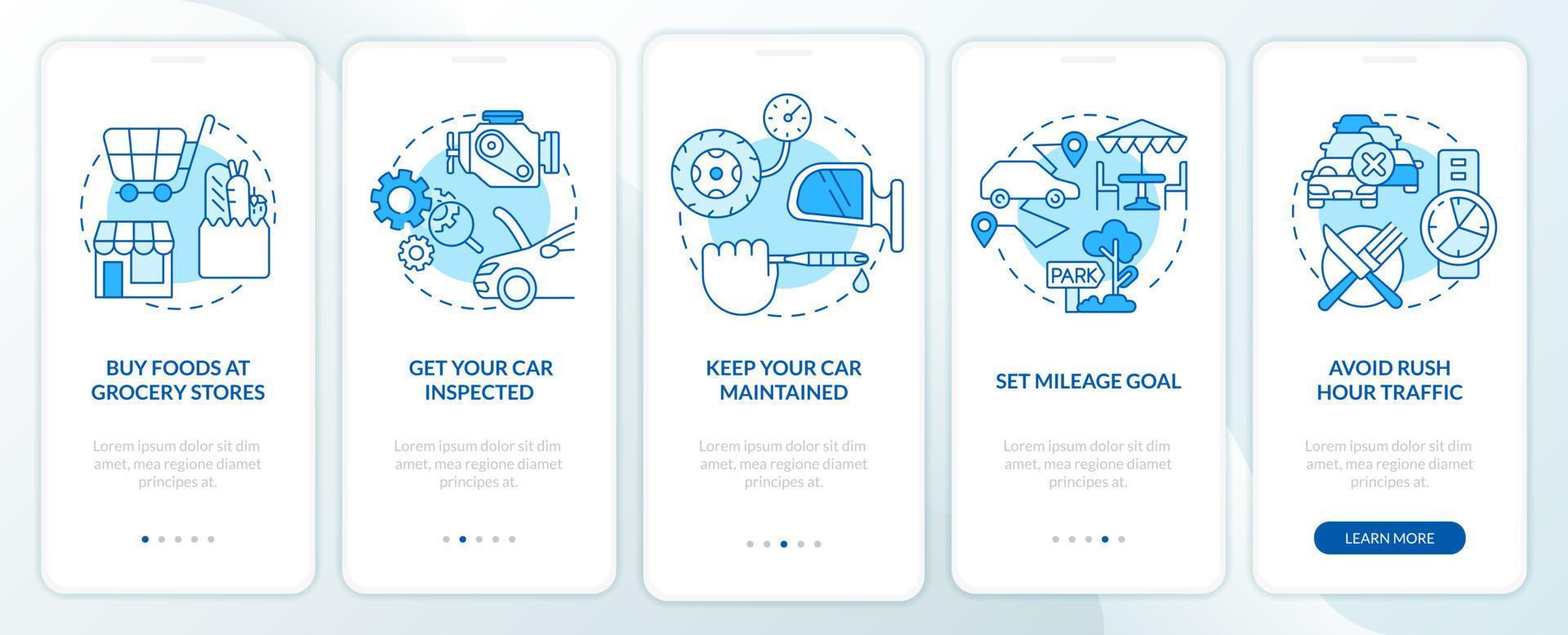 Road trip tips blue onboarding mobile app screen. Car travel walkthrough 5 steps editable graphic instructions with linear concepts. UI, UX, GUI template. Pro Vector