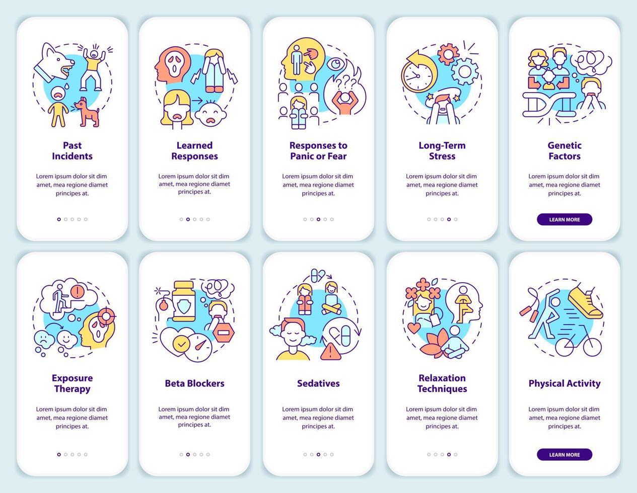 Phobia treatment onboarding mobile app screen set. Anxiety disorder walkthrough 5 steps graphic instructions pages with linear concepts. UI, UX, GUI template. Pro Vector