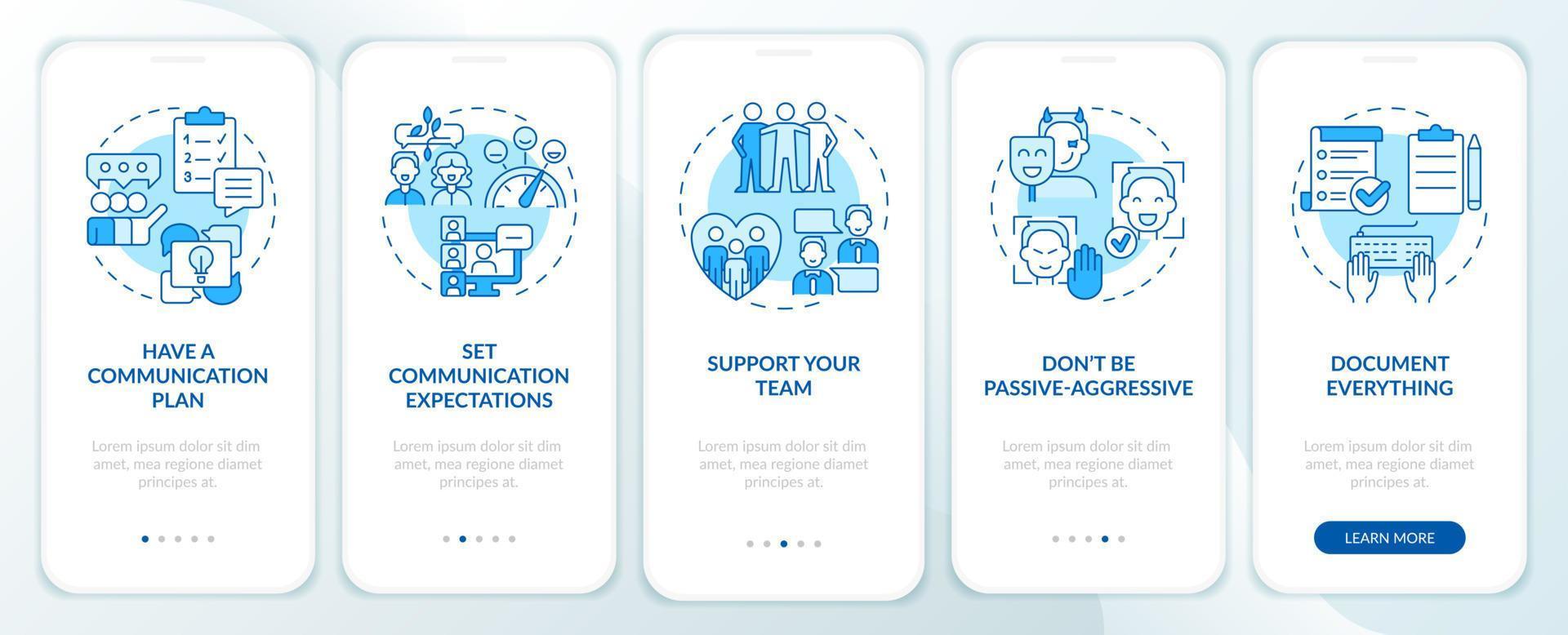 Effective communication management blue onboarding mobile app screen. Walkthrough 5 steps graphic instructions pages with linear concepts. UI, UX, GUI template. Pro Vector