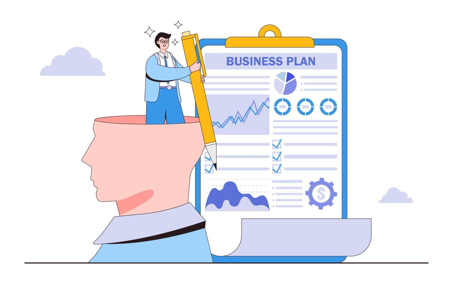 Project management, work tasks, targeting, business development, startup launch concepts. Businessman leader write strategic planning idea and marketing analysis using pen from huge head Pro Vector