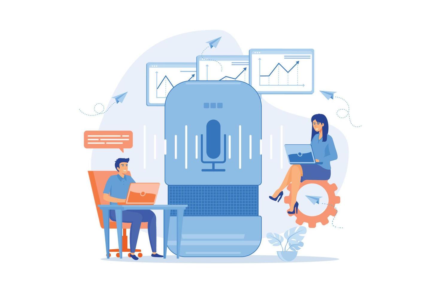 Smart speaker used by office workers. Smart office controller and voice commands, voice controlled office digital devices and Internet of things concept.flat vector modern illustration Pro Vector