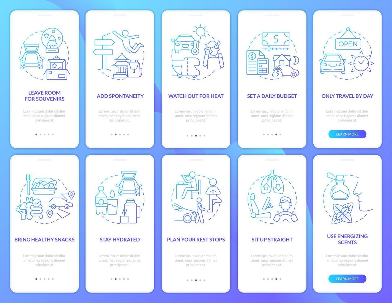 Comfortable road trip blue gradient onboarding mobile app screen set. Walkthrough 5 steps graphic instructions with linear concepts. UI, UX, GUI template. Pro Vector