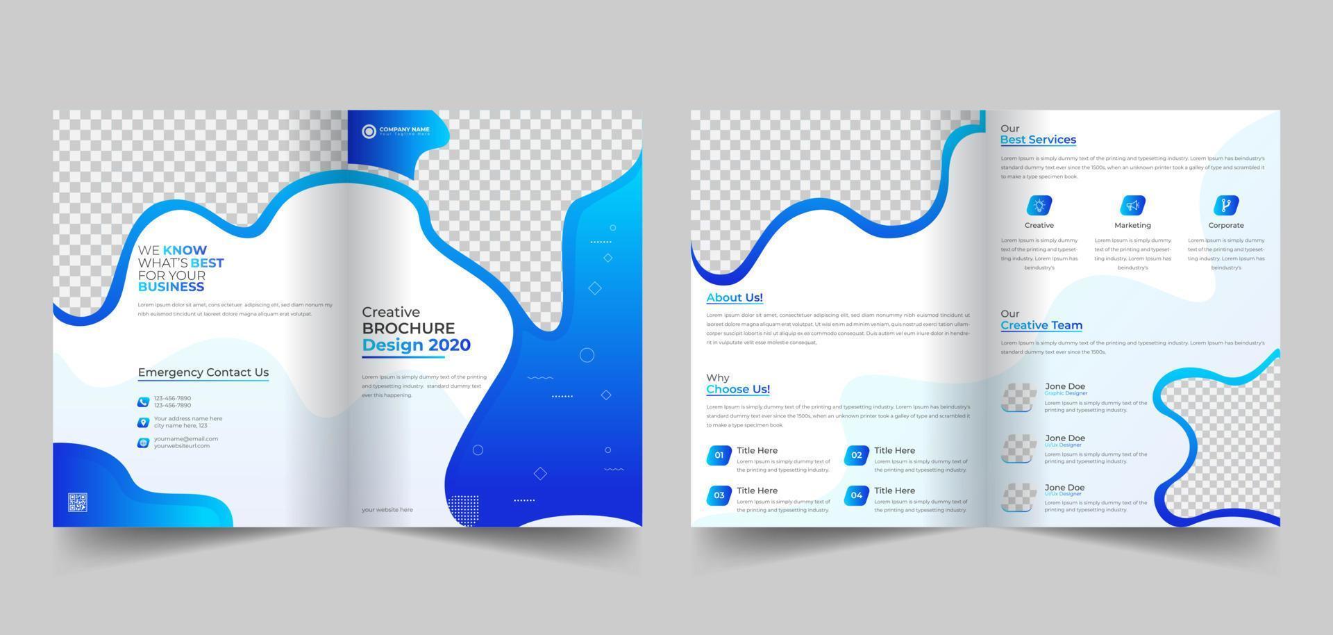 Geometric elements style business bi fold brochure design. With blue gradient shapes, front page design layout template with bleed in A 4 size vector template Pro Vector