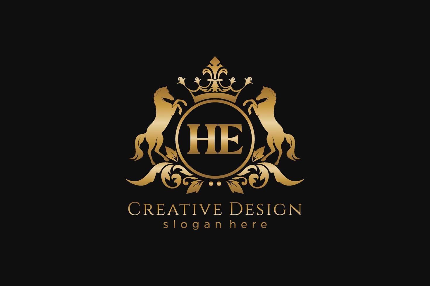 initial HE Retro golden crest with circle and two horses, badge template with scrolls and royal crown - perfect for luxurious branding projects Pro Vector and Pro SVG