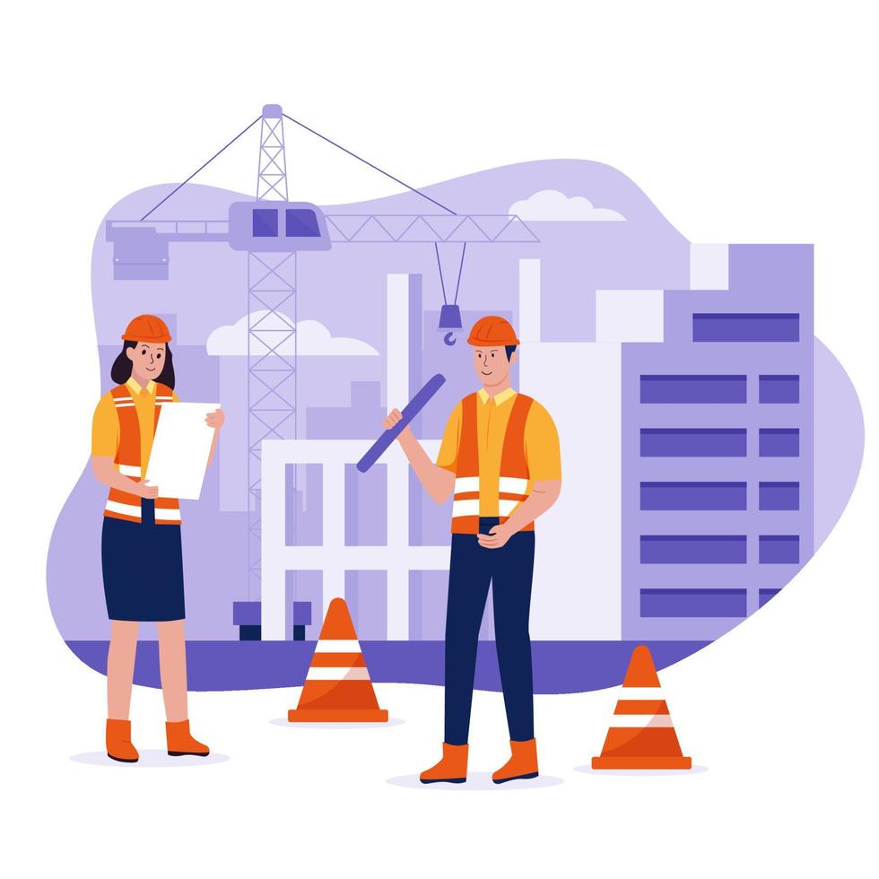 Flat design of civil engineer and architect engineer watching and checking details on a construction Pro Vector