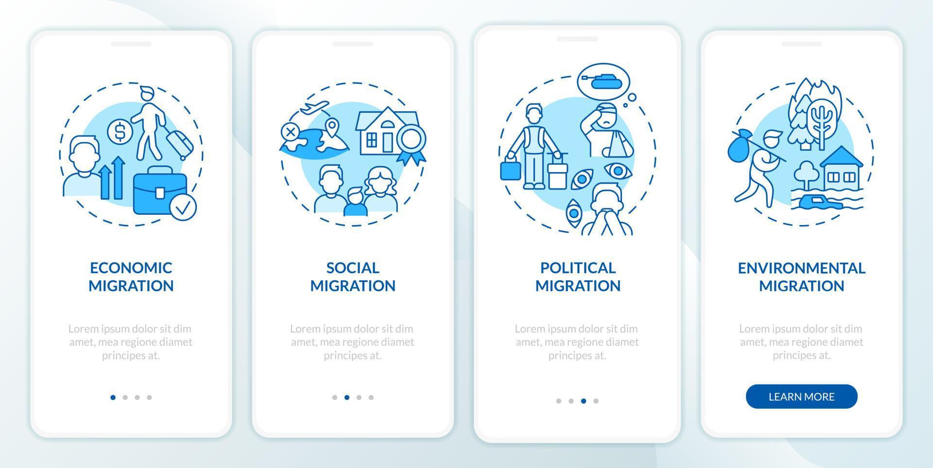 Reasons for migration blue onboarding mobile app screen. Leaving homeland walkthrough 4 steps graphic instructions pages with linear concepts. UI, UX, GUI template. Myriad Pro-Bold, Regular fonts used Pro Vector