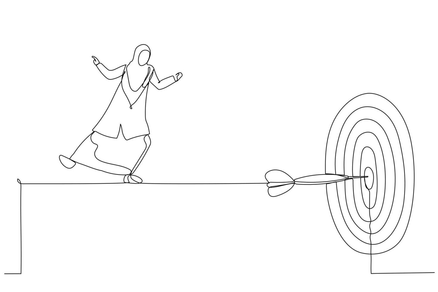 Cartoon of skillful businesswoman acrobat walk on rope to reach bullseye dart target. Metaphor fro challenge to overcome difficulty and achieve business target. Continuous line art Pro Vector
