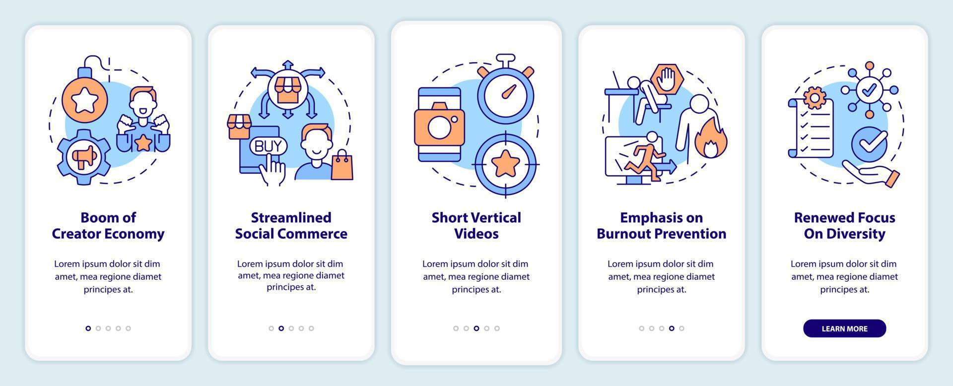 Social media trends onboarding mobile app screen. Digital marketing walkthrough 5 steps editable graphic instructions with linear concepts. UI, UX, GUI template. Pro Vector