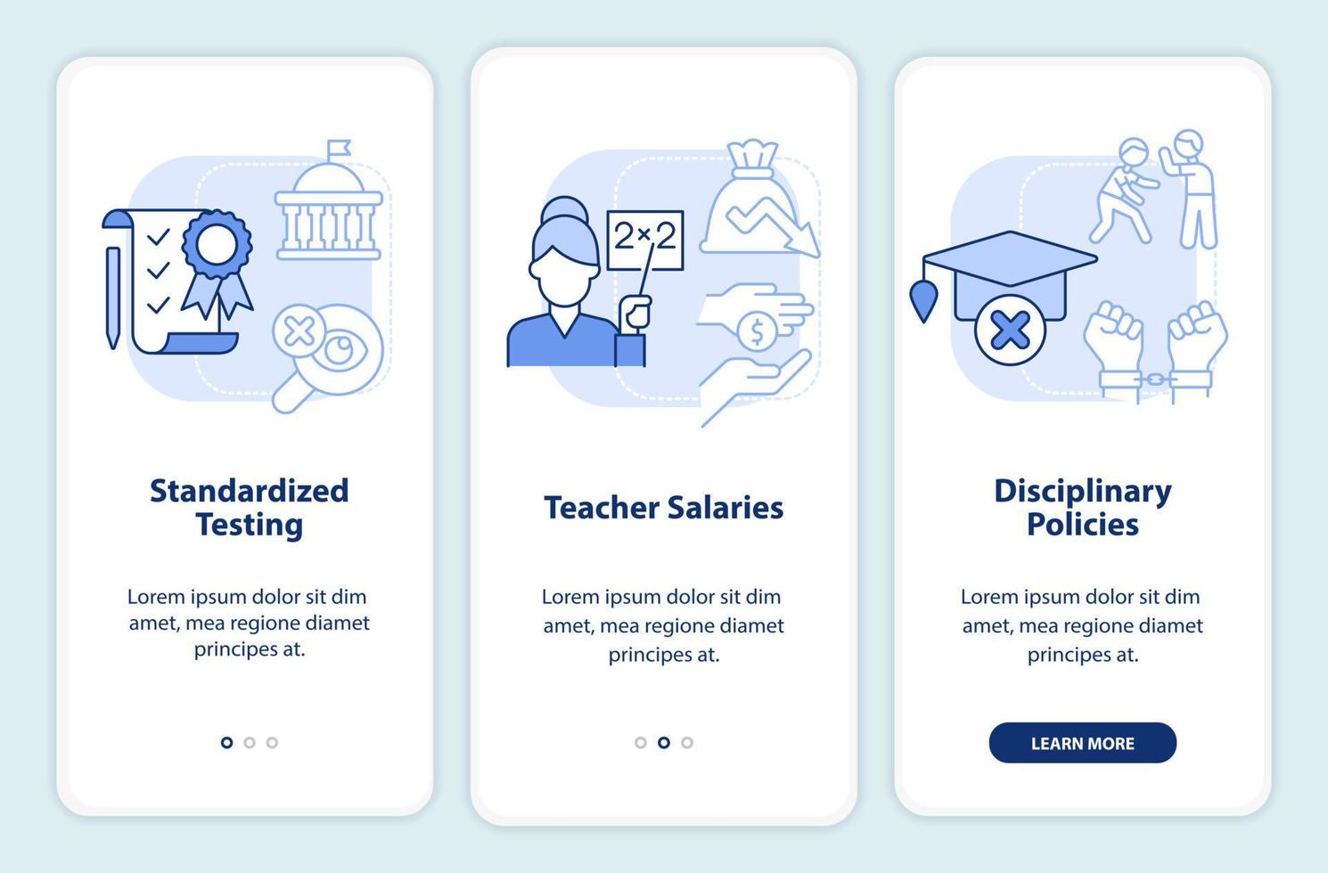 Major education issues light blue onboarding mobile app screen. Walkthrough 3 steps editable graphic instructions with linear concepts. UI, UX, GUI template. Pro Vector