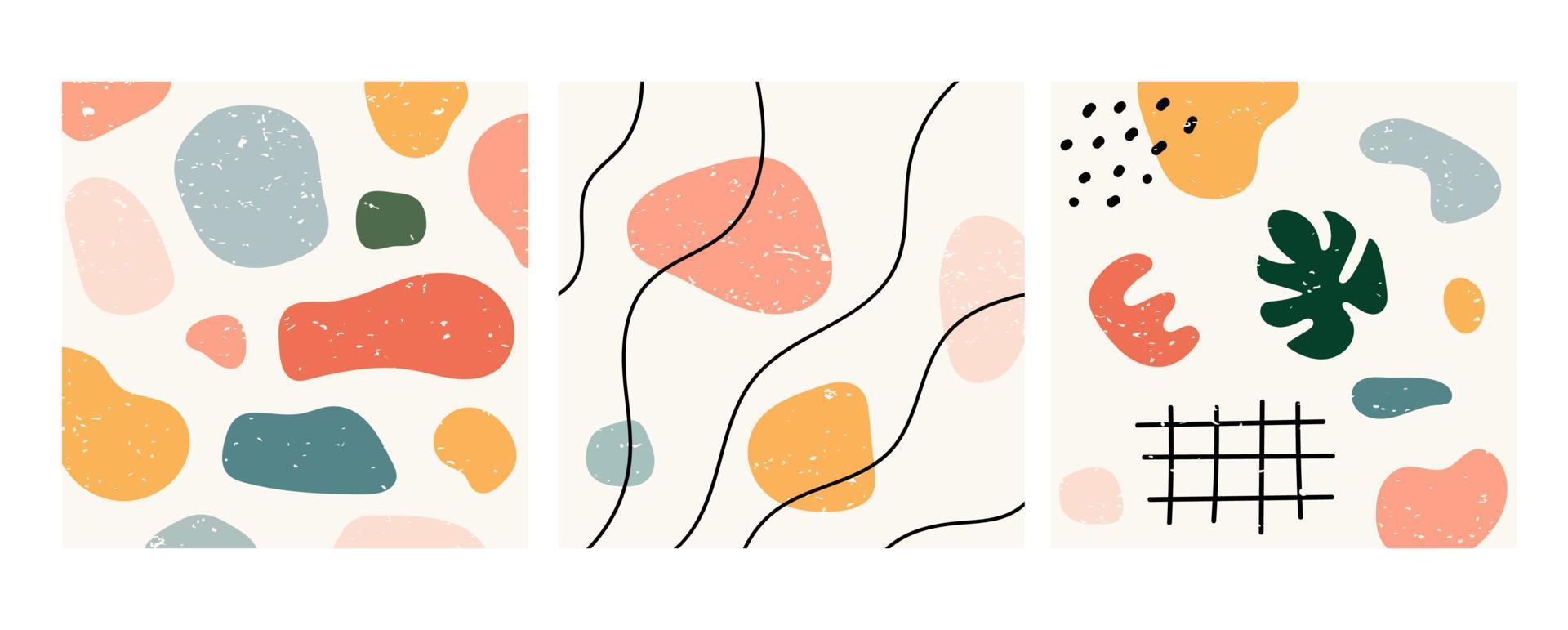 Set of three abstract patterns. Hand drawn various shapes and doodle objects. Abstract contemporary modern trendy vector illustration. Stamp texture. Vector illustration Pro Vector