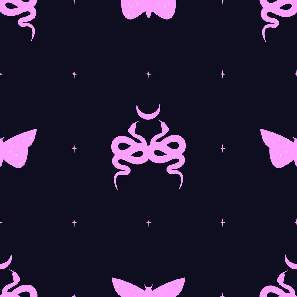 Witch and Magic Collection with moth and snake. Halloween mystical animals vector seamless pattern. Celestial snake, butterfly, moon Esoteric, boho mystical hand drawn elements. Pro Vector