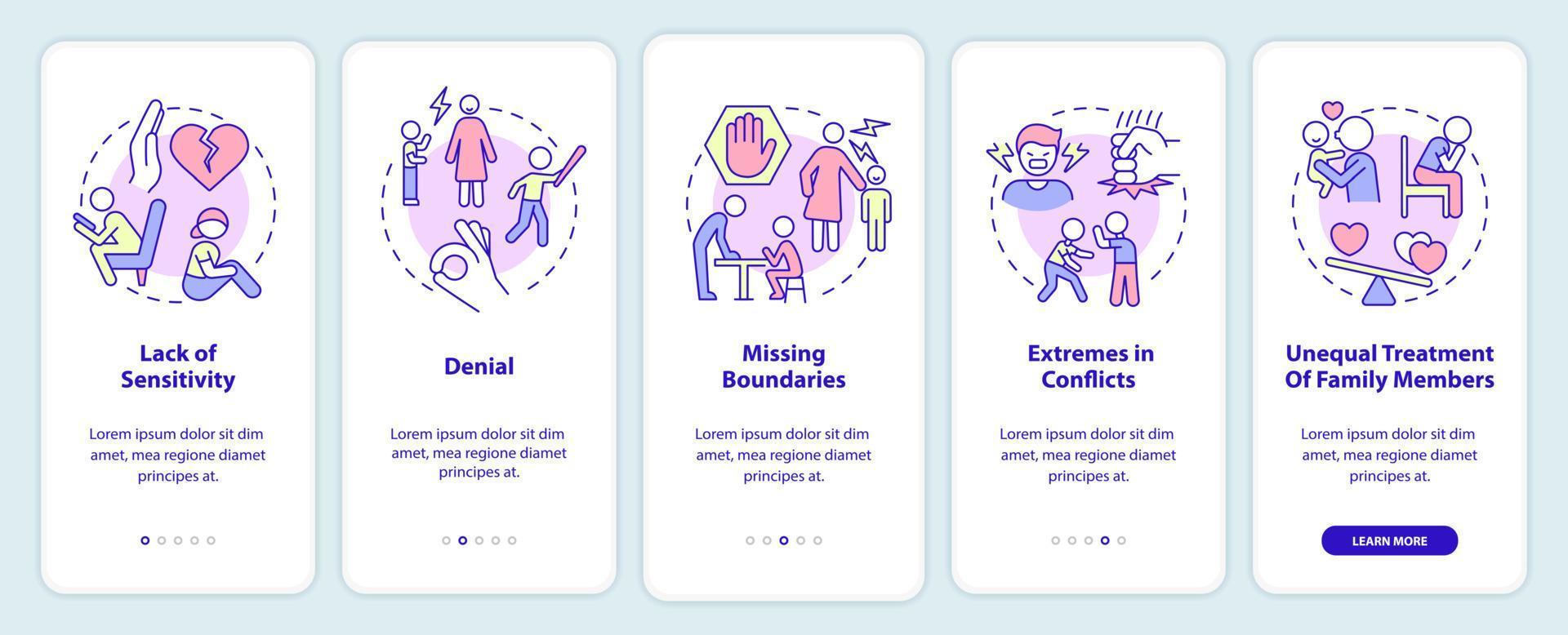 Features of dysfunctional families onboarding mobile app screen. Walkthrough 5 steps graphic instructions pages with linear concepts. UI, UX, GUI template. Pro Vector